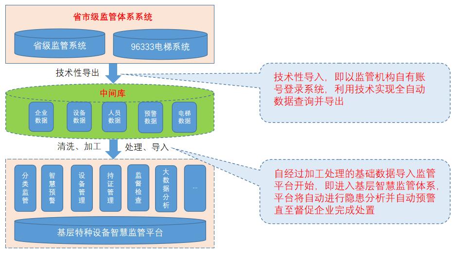 技术性导入,即以监管机构自有账号登录系统,利用技术实现全自动数据查询并导出。自经过加工处理的基础数据导入监管平台开始,即进入基层智慧监管体系,平台将自动进行隐患分析并自动预警直至督促企业完成处置。