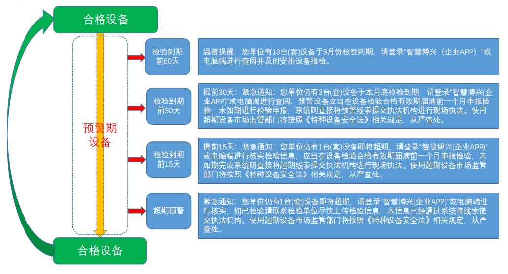 提前30天:紧急通知:您单位仍有3台(套)设备于本月底检验到期,请登录“智慧博兴(企业APP)”或电脑端进行查阅;预警设备应当在设备检验合格有效期届满前一个月申报检验,未如期进行检验申报,系统则直接将预警线索提交执法机构进行现场执法。使用超期设备市场监管部门将按照《特种设备安全法》相关规定,从严查处。